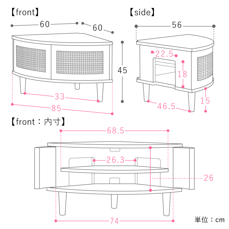 一般的なコーナーテレビボードよりも、もう一段階スリムに。「置けるテレビのサイズ」と「コンパクトさ」のバランスを、ギリギリまで追求しました。