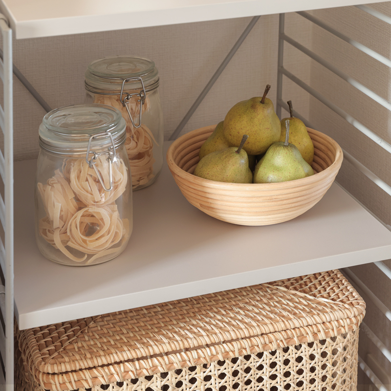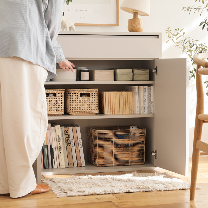 開き戸タイプで収納量が多いラタンキャビネット。 棚板で仕切れるので、食器や食料品のストックなど、細かく仕分けて収納するのに便利です。 床置きができるので、単体で使えるというのもポイント。ラタンを使った意匠も魅力的です。