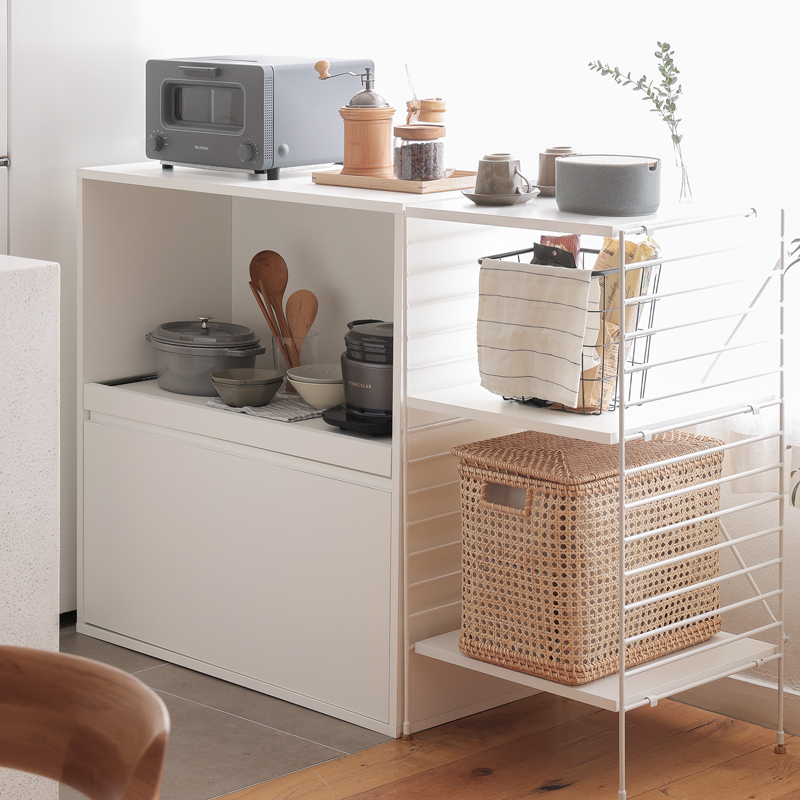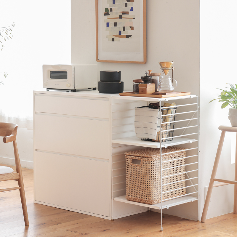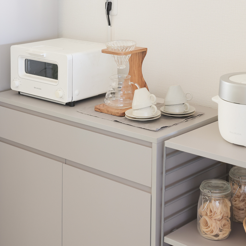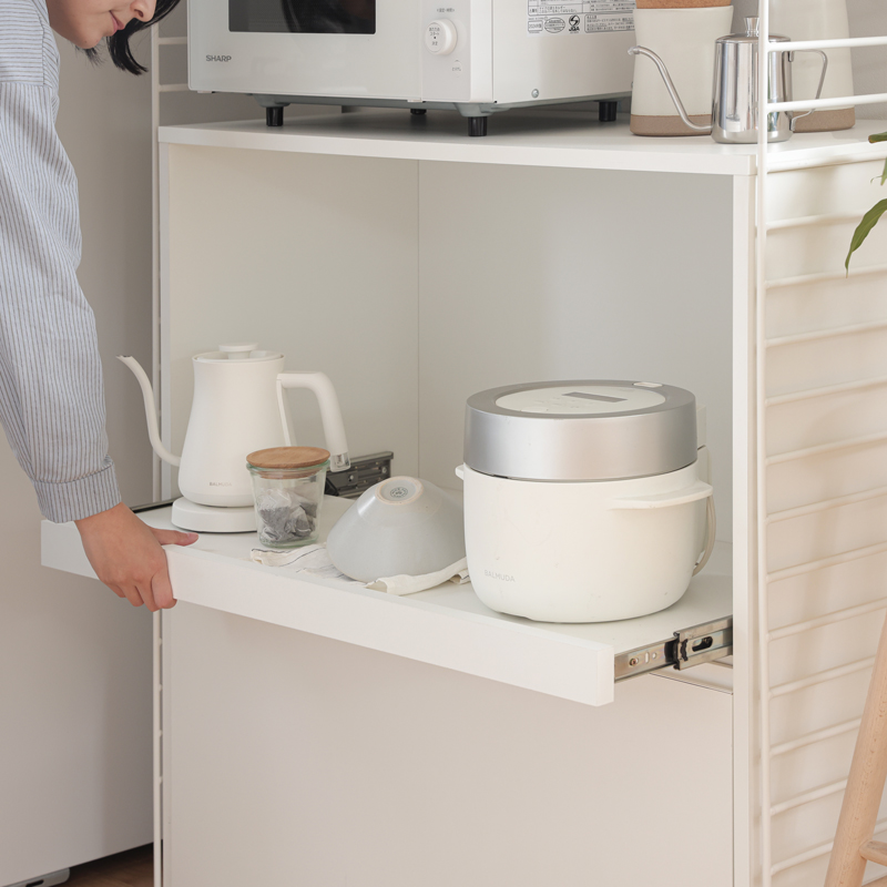 上段に、スライドして引き出せる棚を取り入れたスライド棚付ドロワー。 炊飯ジャーやケトルなどを置いて、使うときだけさっと手前に動かせる便利な収納です。 ウレタン塗装で水にも強いため、天面でちょっとした調理をすることも可能。