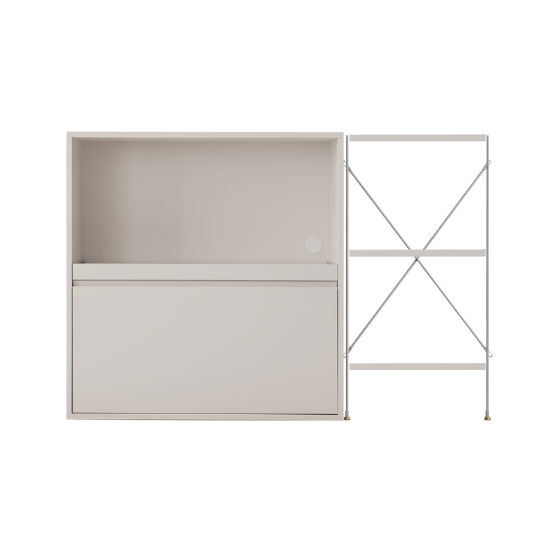 マットな質感でオーク突板材の風合いとも相性がよく、シェルフ全体に高級感を感じさせます。カラーはホワイト、グレー、ブラックの3色展開です。