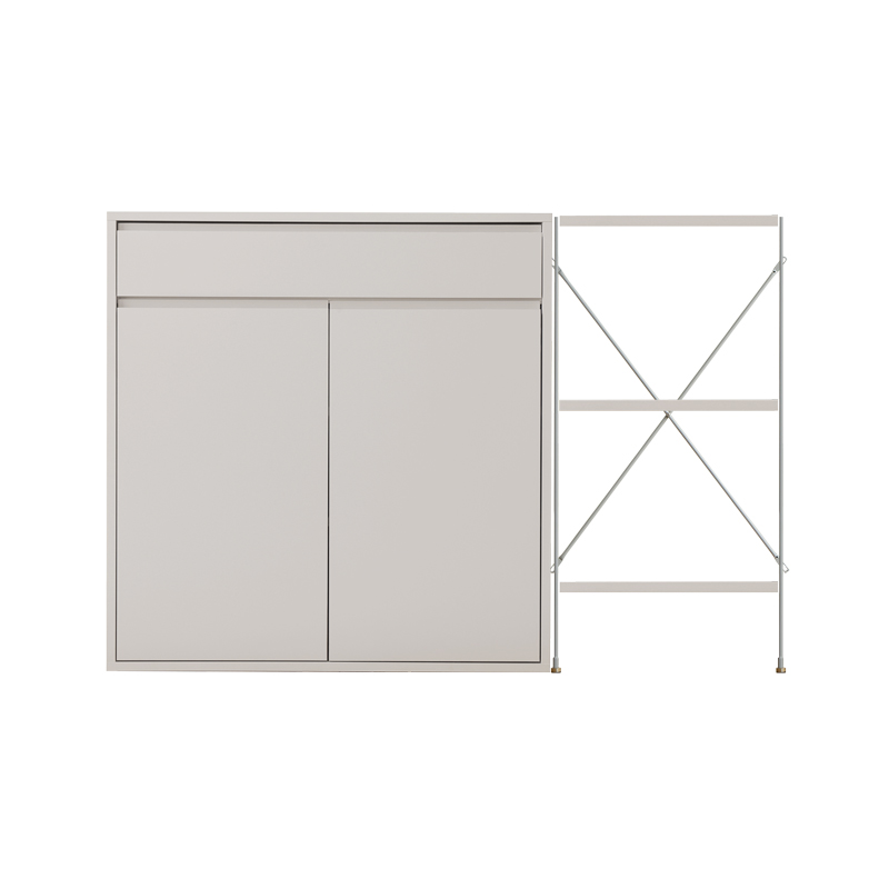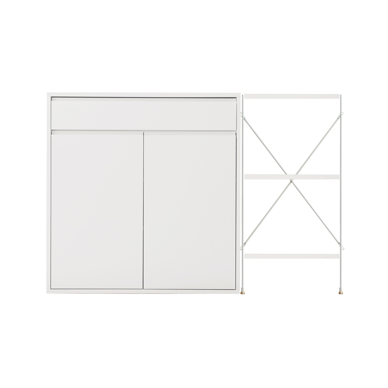 上段に浅めの引き出し、下段に大きな扉収納を配したドロワー付キャビネット。 ダイニングやリビングに1つあれば、隠しておきたい日用品から本や雑多なものを、ぱっとしまうのに最適。 キッチンでは、カトラリーや食器類を片付けるのに便利です。