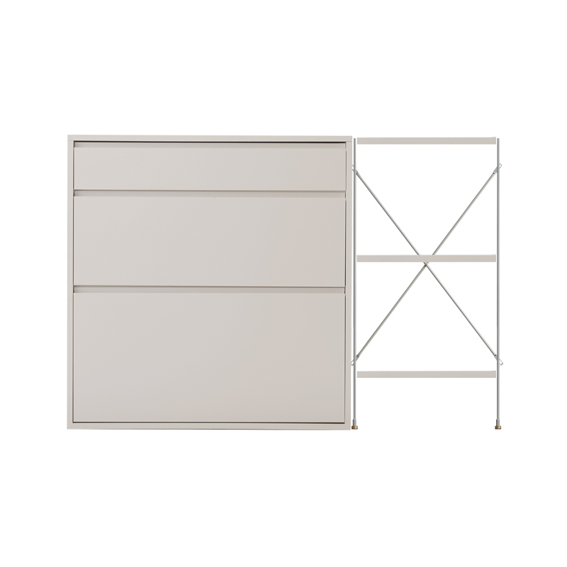上から順番に深さ違いの引き出しを備えている3段ドロワー。 小さな物から大きな物まで入れることができ、リビングや寝室では洋服ダンスとして、 キッチンでは、カトラリーからお皿や鍋までしまえるキッチン収納としてお使いいただけます。