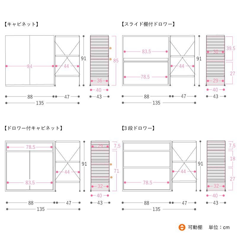 たくさん物が並べられて、ちょっとした作業台にも使える88cmタイプと、
