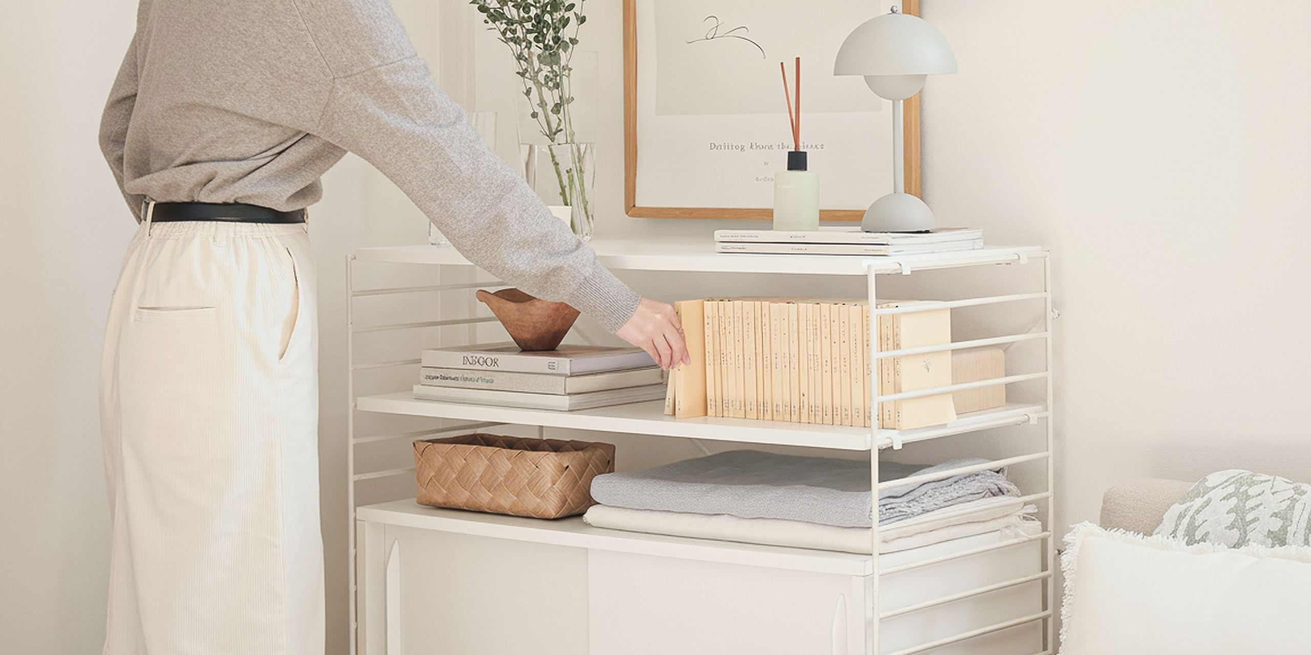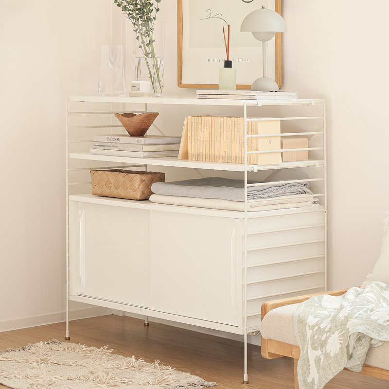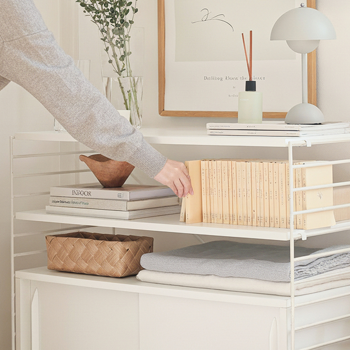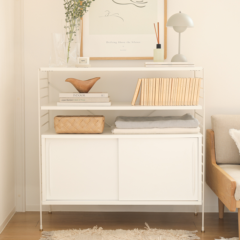 壁面を覆う大型のブックシェルフから、コンパクトなシェルフやTVボードまで、使う場所に合わせた様々な組み合わせが可能です。