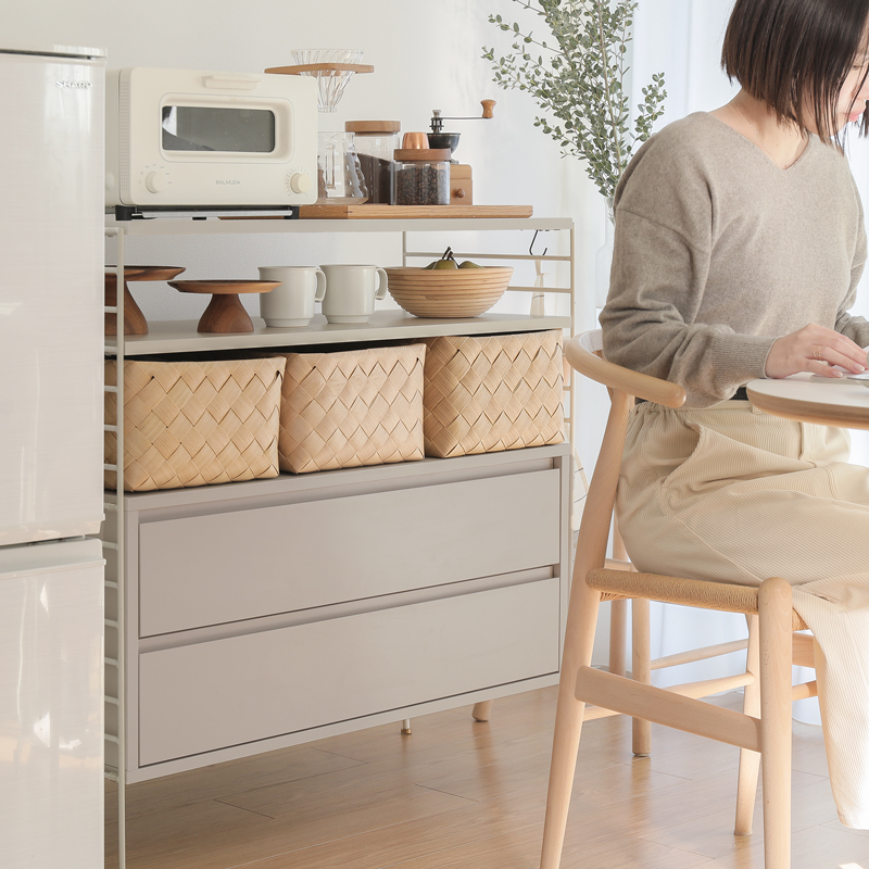 上段に、スライドして引き出せる棚を取り入れたスライド棚付ドロワー。 炊飯ジャーやケトルなどを置いて、使うときだけさっと手前に動かせる便利な収納です。 ウレタン塗装で水にも強いため、天面でちょっとした調理をすることも可能。