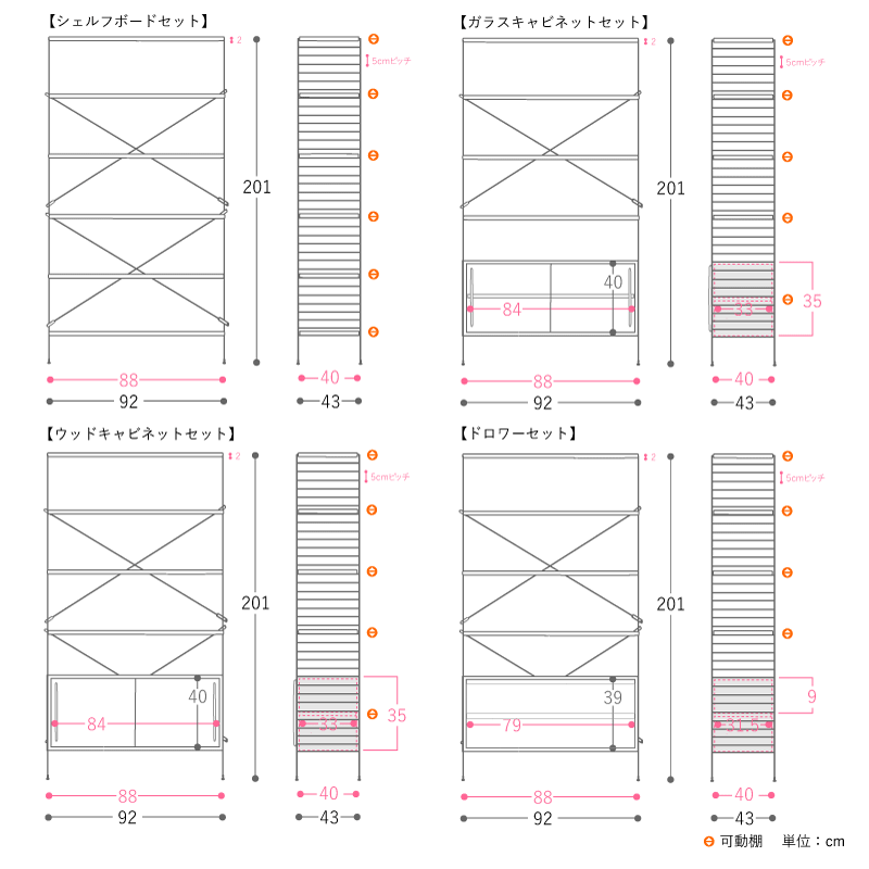 背の高い物から背の低い物までぴったり収められるよう、アイアンフレームのピッチは5cm刻みに設定。