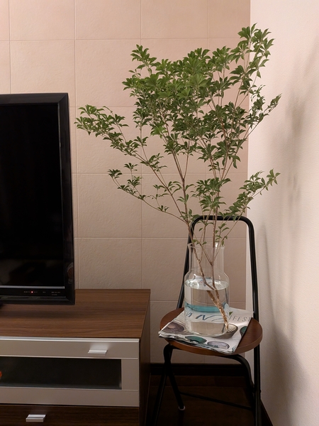 グリーンがあるとお部屋が一気に爽やかな雰囲気に包まれ、なんだか穏やかな気持ちに。大きな枝ものはお部屋の印象を簡単に変えられるのも嬉しいところです。