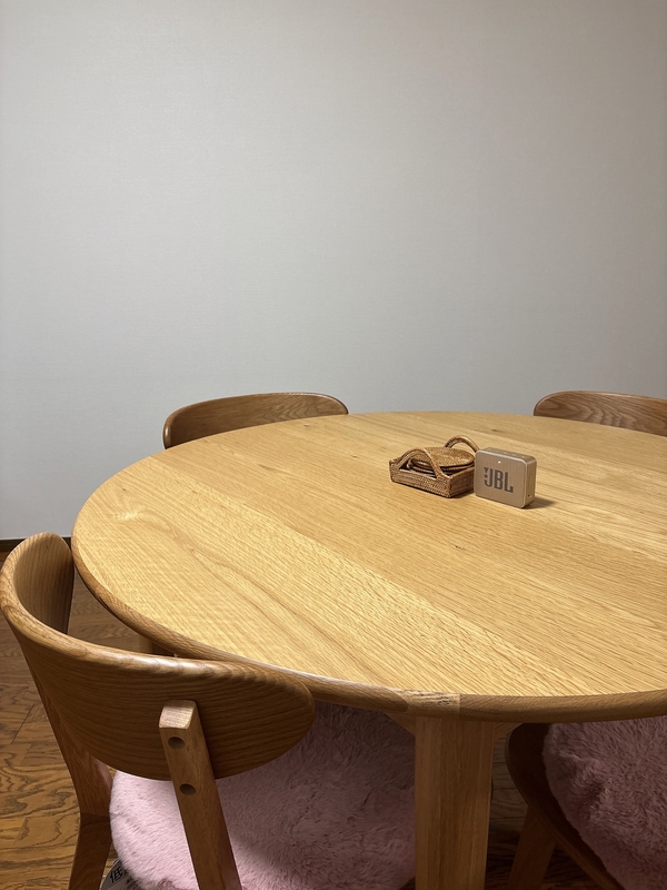 私にとっての僅かな残念ポイントを挙げるとしたら90cmの丸テーブルには少し大きく感じ、