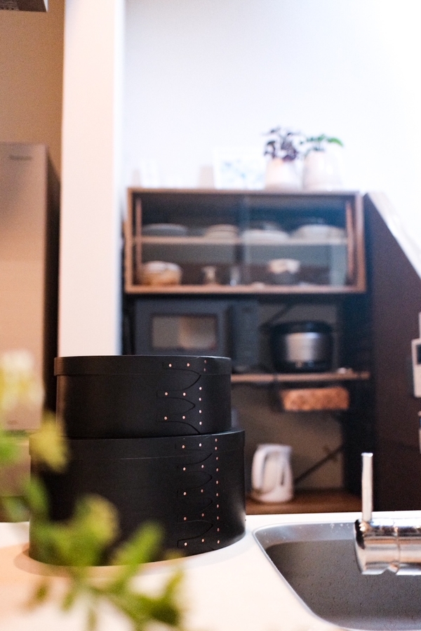 カゴ収納ばかりだと少し単調になりがちな空間に、このシェーカーボックスを置くだけで一気に雰囲気がおしゃれになりました。